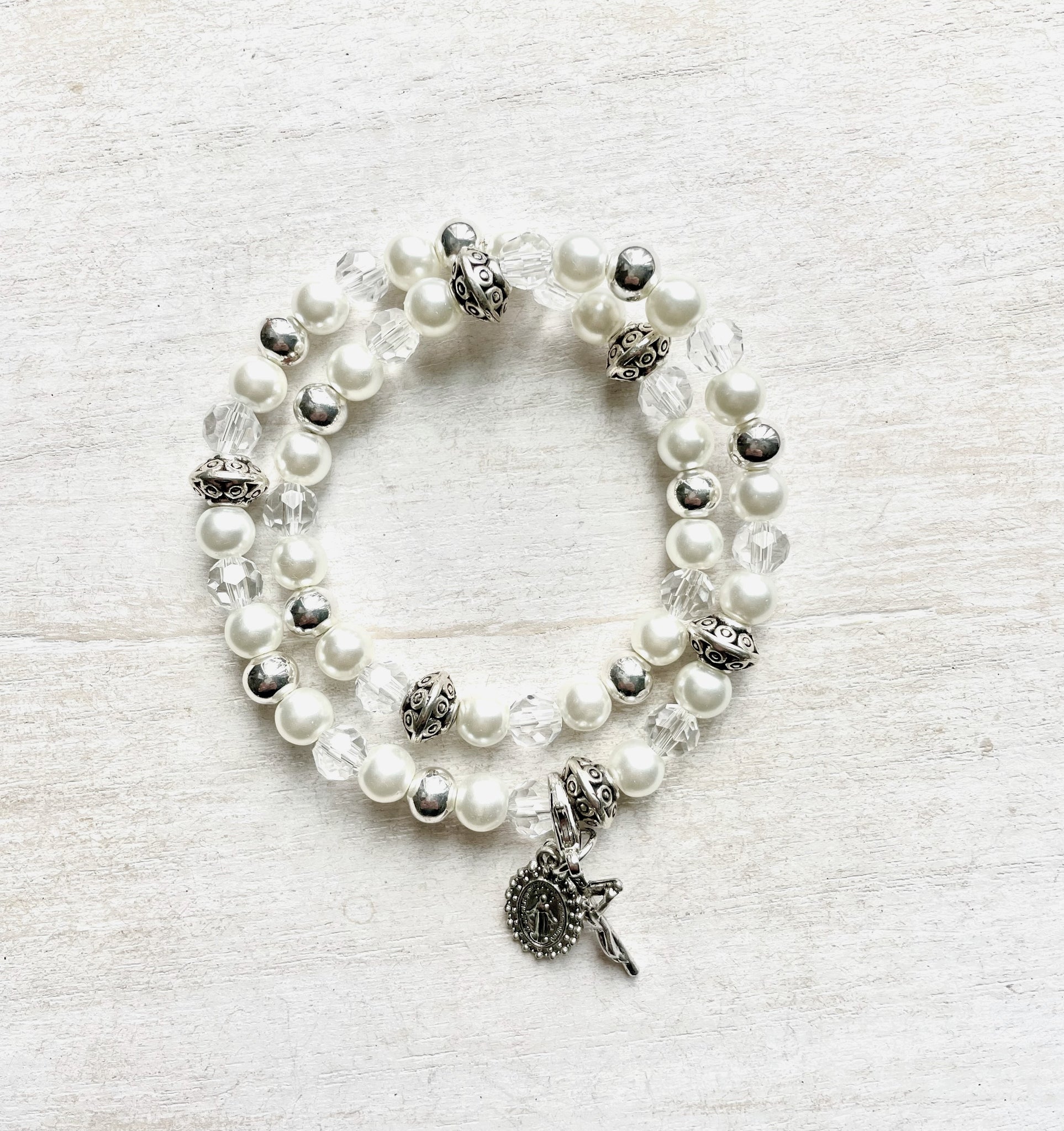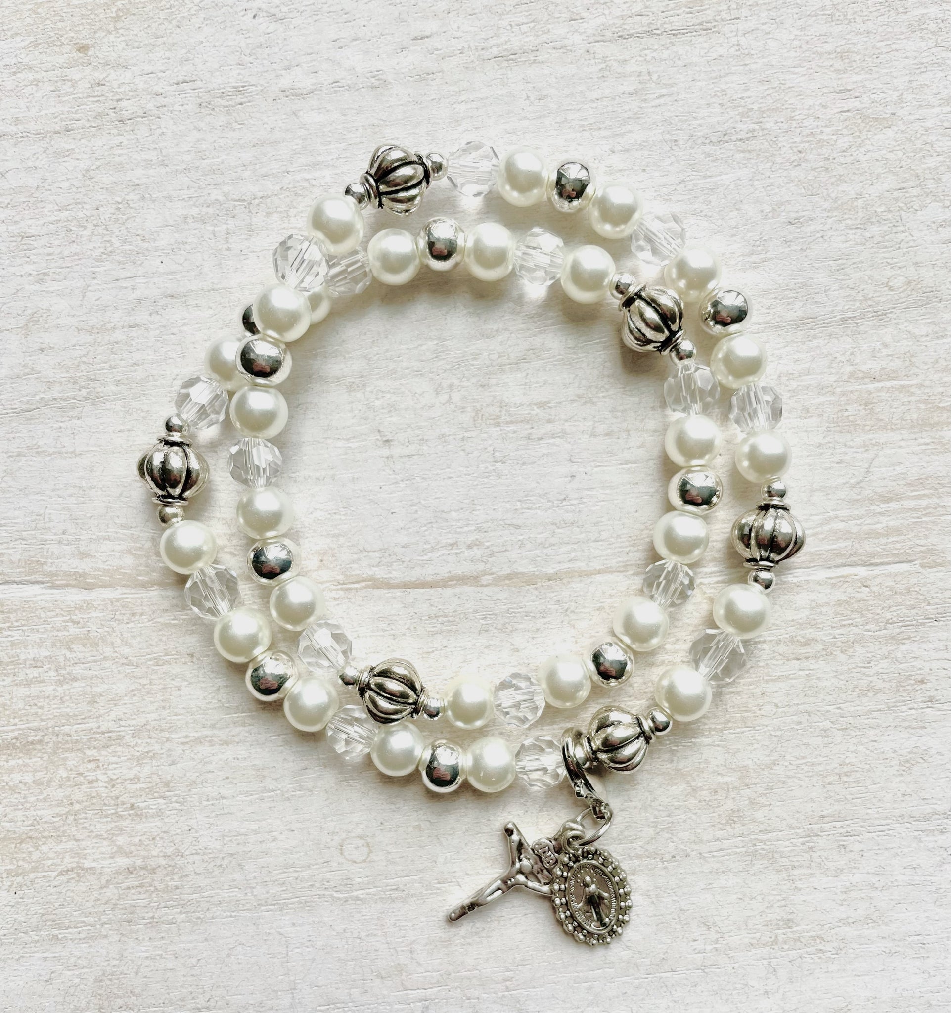 This elegant bracelet can be worn for any occasion, but it is especially fitting for a bride because every bride needs a rosary to carry on her wedding day! It is designed with pearl-colored glass beads, clear glass crystals, and silver-plated beads that make it the perfect addition to the beautiful bride. Even after the bouquet is tossed, this bracelet remains with the bride. It is an ideal gift for a bridal shower.